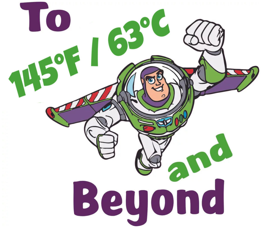 As per the USDA website: “Cooking Whole Cuts of Pork: USDA has lowered the recommended safe cooking temperature for whole cuts of pork from 160 ºF to 145 ºF with the addition of a three-minute rest time.” We are going to reach 145 ºF long before we are done cooking this roast. So, don’t consider this roast “done” at 145 ºF. Paraphrasing Buzz Lightyear, “To 145ºF / 63ºC and BEYOND!”